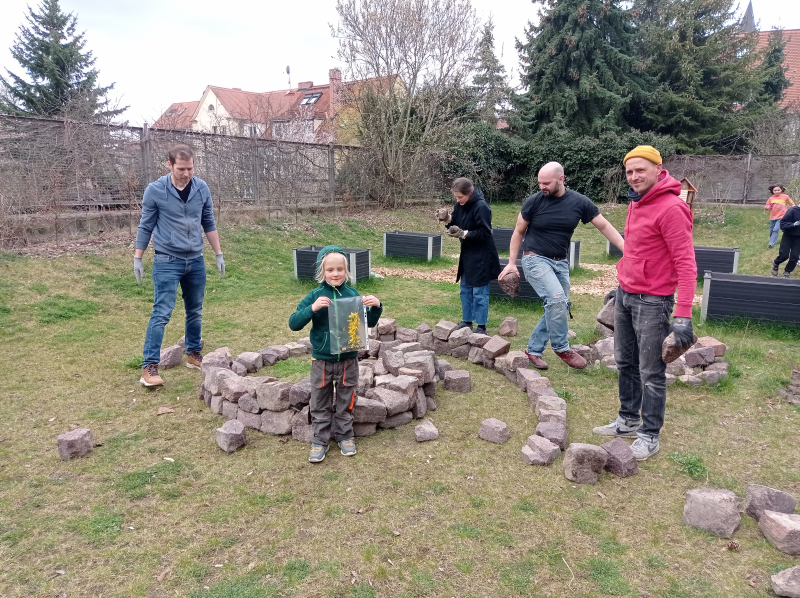 Es wurde der Weidenpalast vergrößert, die Kräuterspirale beendet, ein Blumenbeet angelegt und im Schulhaus hat der Frühjahrsputz begonnen.